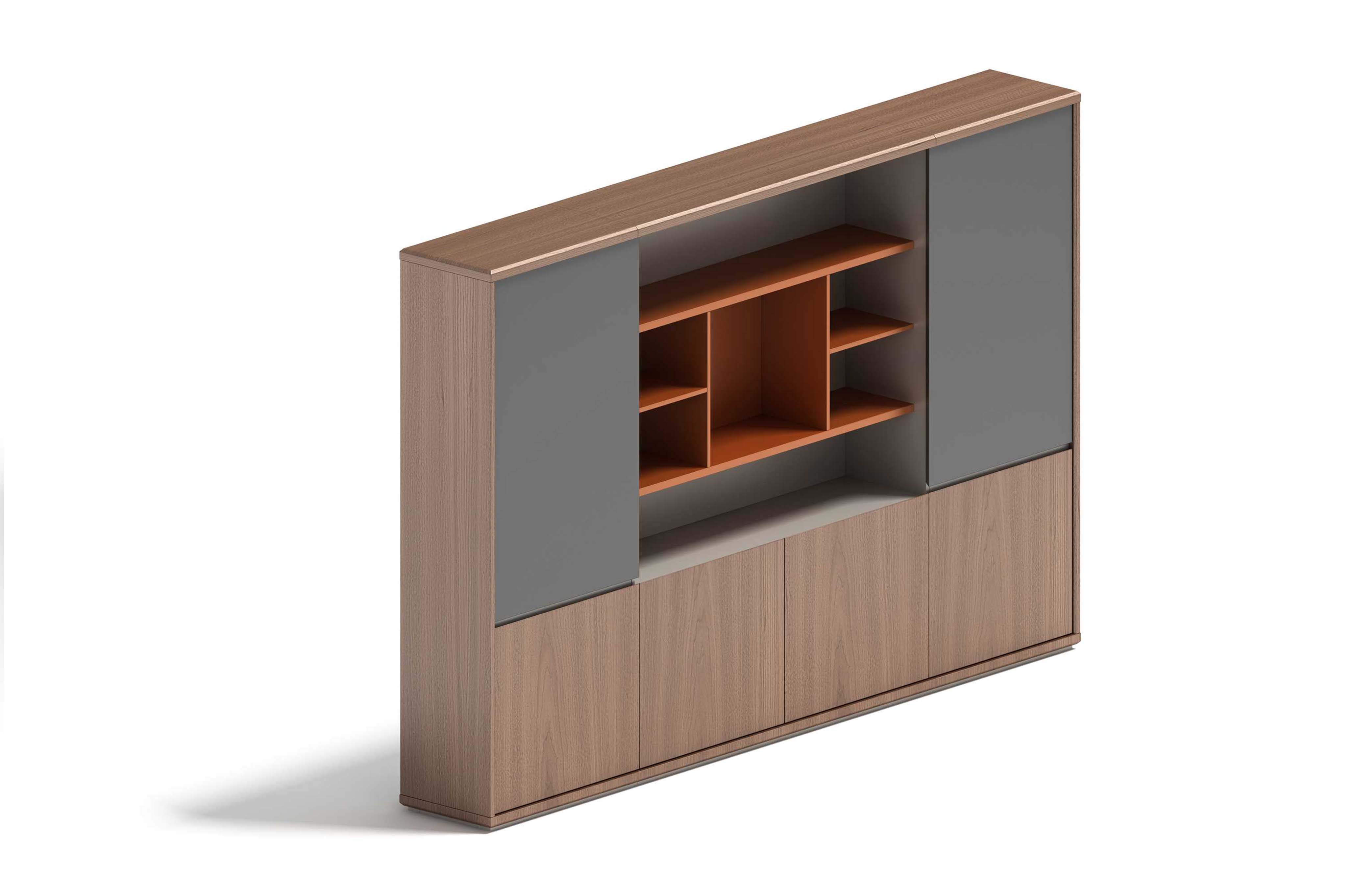 1.工藝:見光面采用E0級中密度纖維板+0.6mm天然木皮做水性漆/實色水性漆,非見光面采用E0級刨花板貼三聚氰胺飾面 2.封邊:見光面天然木皮封邊/實色水性漆,非見光面采用優質PVC封邊 3.配件:“BMB”牌 緩沖門鉸;