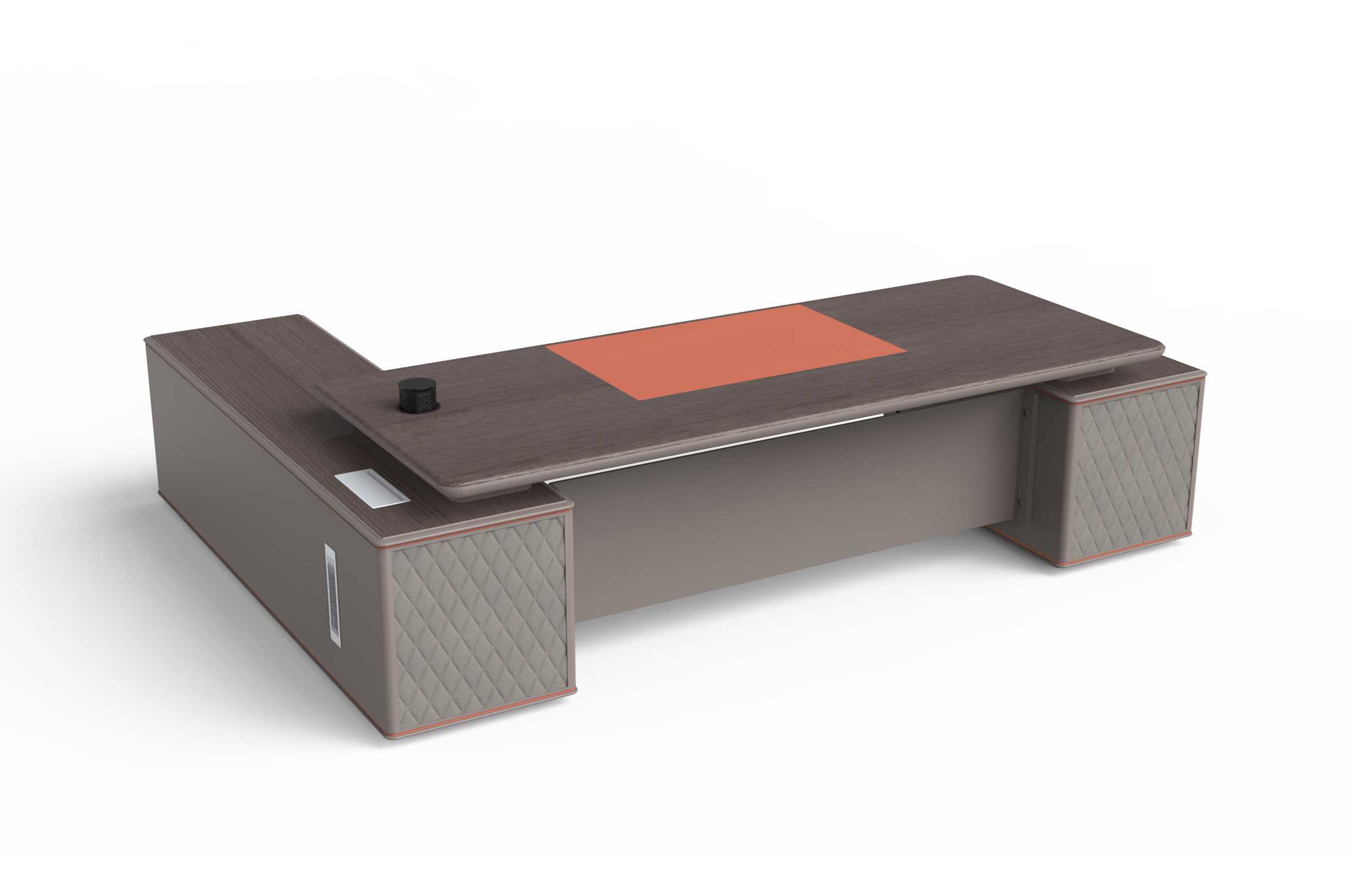 1.工藝:見光面采用E0級中密度纖維板+0.6mm染色木皮做水性漆/實色水性漆 2.封邊:見光面天然木皮封邊/實色水性漆 3.細節:臺面帶固定皮墊,抽面捫皮,副柜帶捫皮裝飾板; 4.配件:“BMB”牌緩沖導軌+“BMB”阻尼門鉸+鋁合金金屬散熱蓋+金屬支撐腳+優質ABS底盒; 5.走線:副柜內部走線,內配?80圓形過線盒,副柜配高端電動翻轉電源; 6.班臺分左右; 7.桌面可選配無線暗彈電源