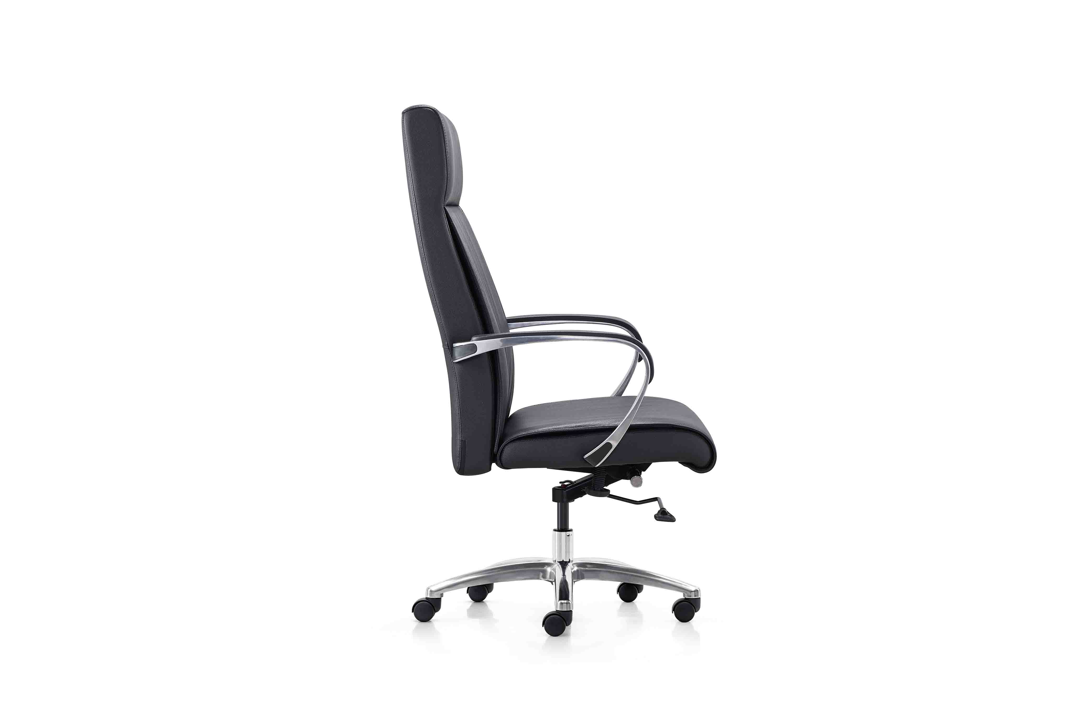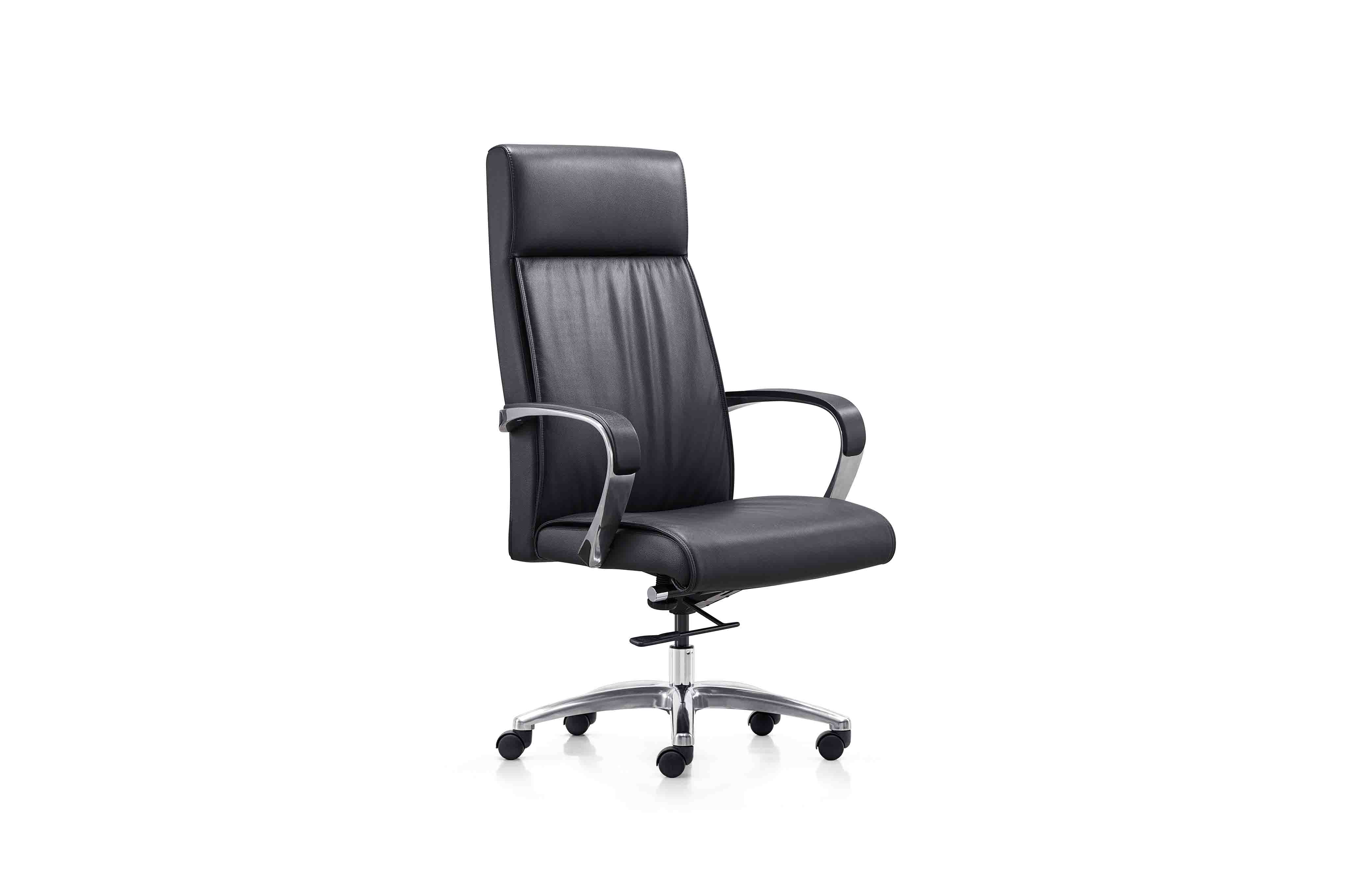 1.優質皮革飾面; 2.鋼制內背架; 3.高密度高回彈海綿; 4.電鍍+尼龍組合扶手; 5.升降、傾仰單手柄帶拖多檔鎖定底盤; 6.韓國品牌威亞斯4級氣桿; 7.鋁合金面包腳; 8.尼龍面包輪 坐高:45cm 坐深:49cm