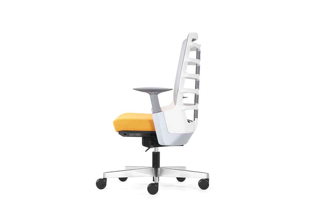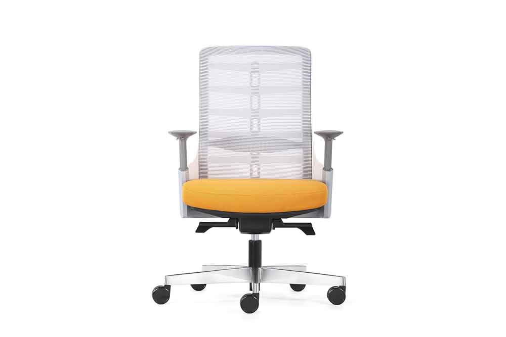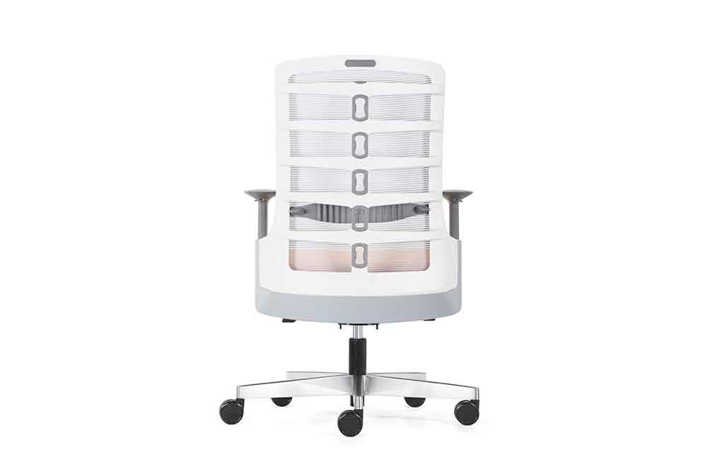 1.聚丙烯(PP)注塑成型椅背, 椅座; 2.熱塑性彈性體(TPE)注塑成型椅背軟骨件:灰色; 3.鋁合金壓鑄成型精拋光:椅背及扶手托架, 五星腳; 4.升降扶手(10公分)配聚氨酯(PU)灰色扶手面; 5.聚氨酯(PU)定型高回彈座棉; 6.上下調節腰靠 10公分 及 前后調節椅座6公分; 7.意大利Donati自重調節機關; 8.韓國三弘四級汽壓升降調節;
